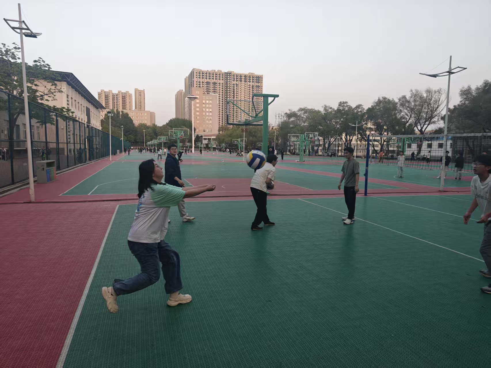 排球如白鸽掠空,队员目光凝定,手腕轻抖间球影翩跹。垫传弧线似弦月,步伐交错如舞步。同学们相互鼓励点拨,默契于无声中生长,击球声与喝彩交织成春日的韵律。