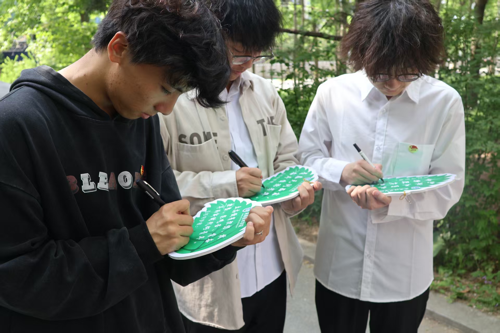 活动尾声,新团员们郑重接过特制的“小绿叶”誓言牌。他们饱含深情,在绿叶牌上亲手写下“替河山装成锦绣,把国土绘成丹青”的青春承诺,并庄重签下自己的名字。这不仅是东林人代代相传的绿色使命,更是新团员们将入团誓言与专业理想、家国情怀相融合的生动诠释。他们轻轻将这承载着绿色梦想与青春誓言的绿叶牌,悬挂在亲手修剪过的云杉树枝头。