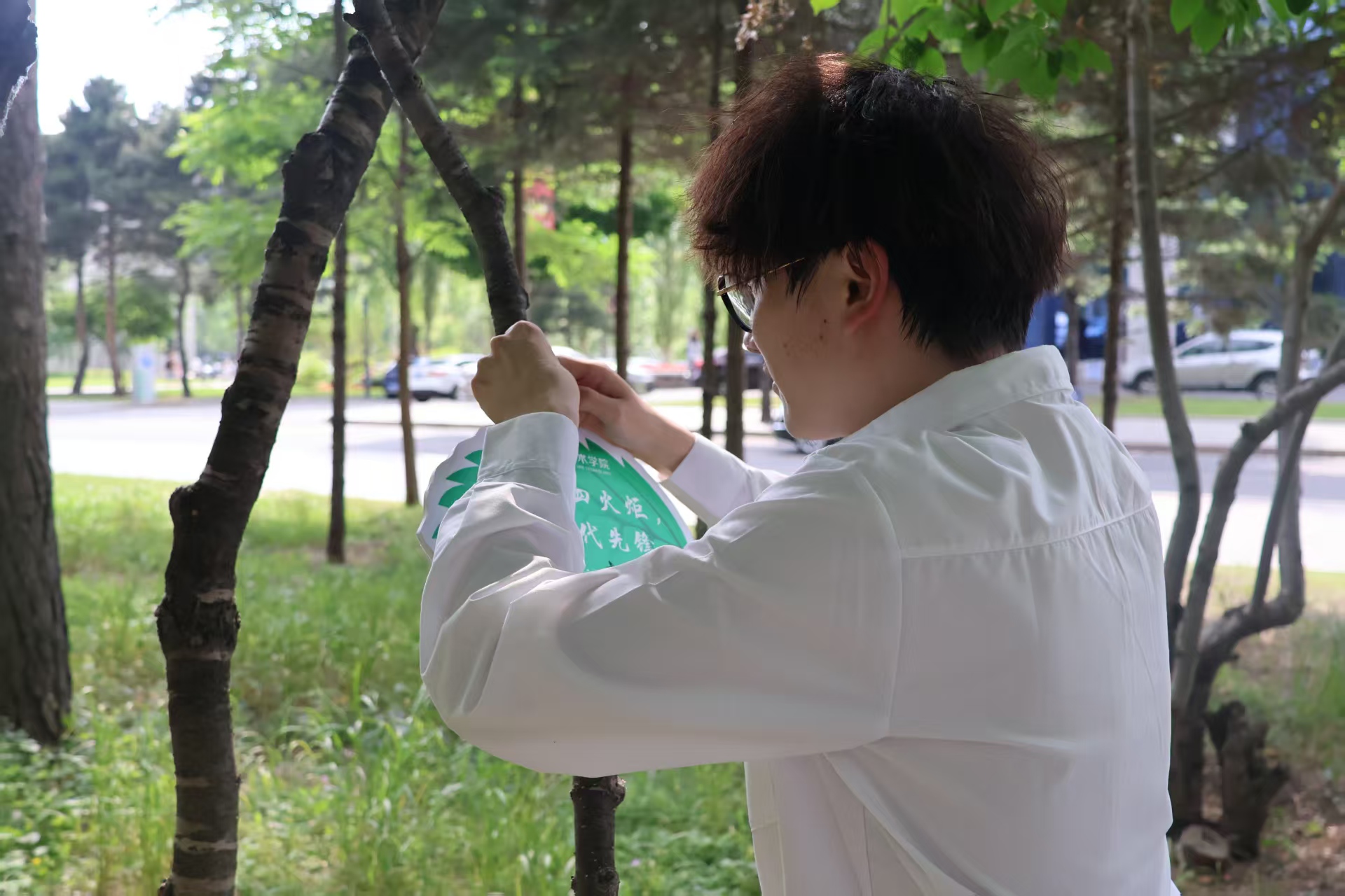 微风吹过,绿叶牌与云杉新叶一同摇曳,仿佛是新团员们无声的宣告:守护这片绿,就是守护心中许下的诺言,从脚下校园的这片青翠开始,迈向未来妆点锦绣河山的壮阔征程。每一片绿叶牌,都是青春与自然的对话,更是新团员们将入团誓言付诸行动的永恒印记。