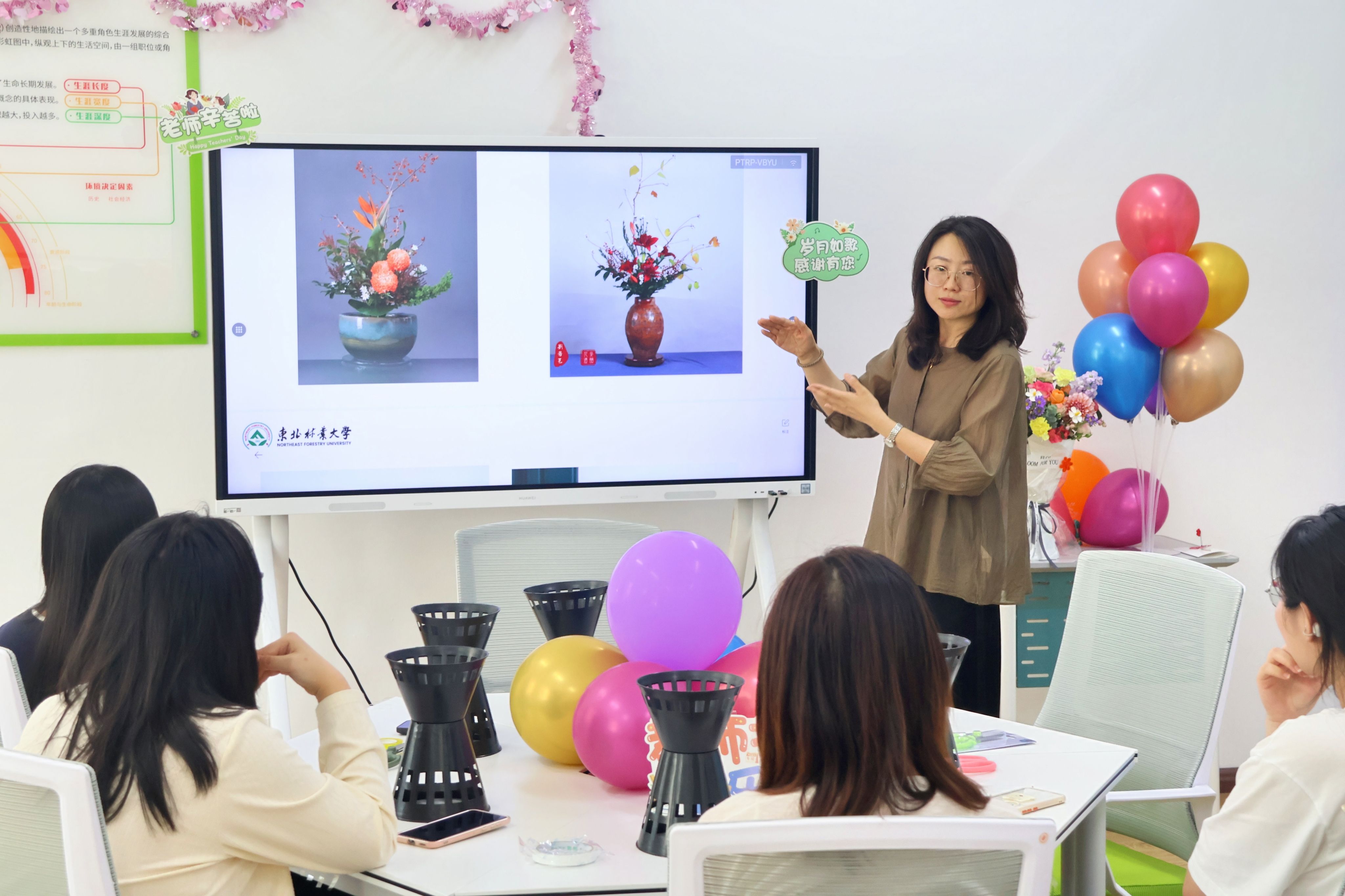 现场笑语不断,师生之间的亲切交流与互动,让教师节的意义愈发鲜明。活动不仅是一次美育实践,提升了同学们的审美素养和动手能力,更是一座情感交流的桥梁,让尊师、感恩之心在花香之中静静流淌。