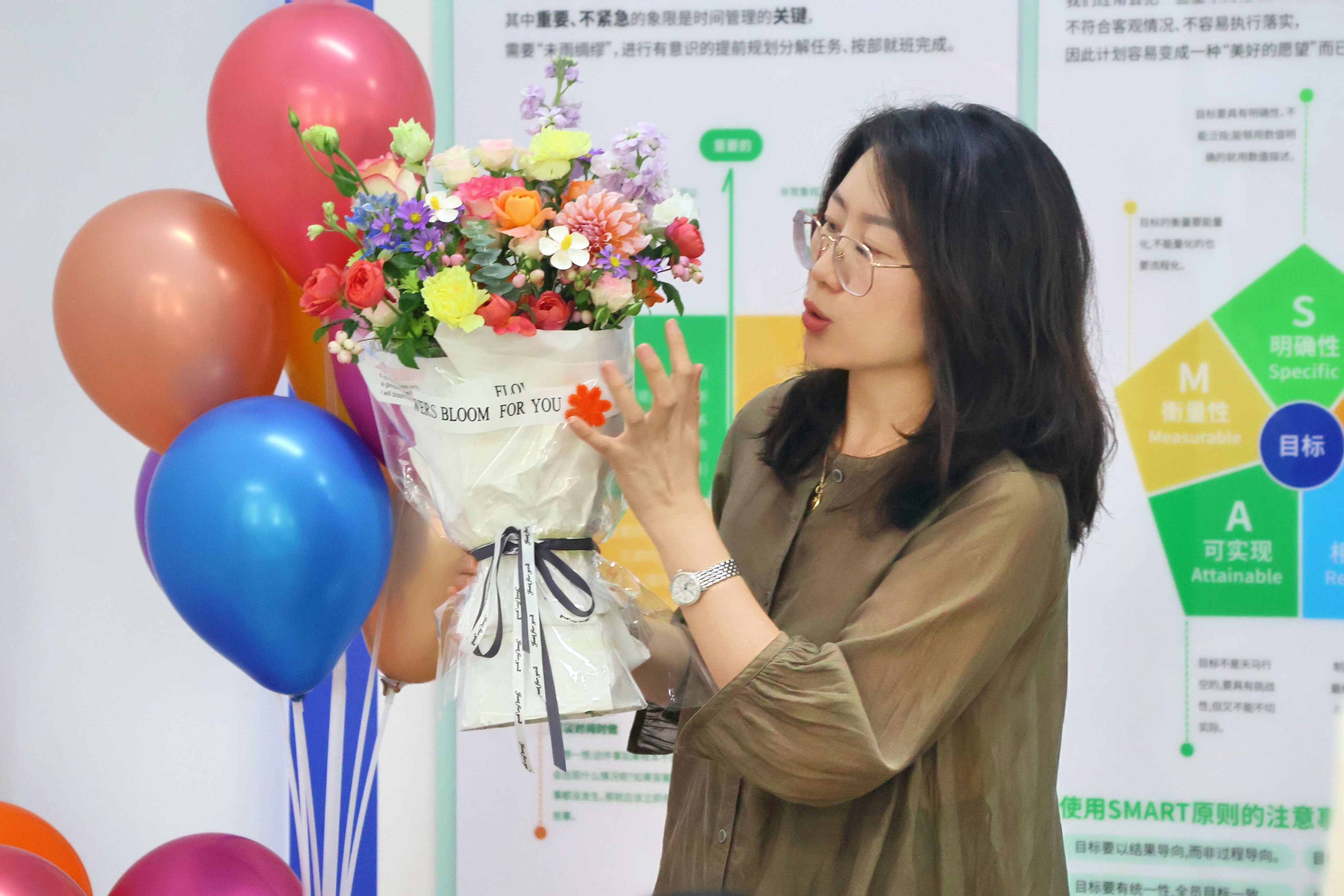 “我要把这束花送给辅导员李老师,感谢她一直以来的陪伴与指引。”“这束想送给陈老师,感谢他每次耐心为我答疑解惑。”同学们一边创作,一边分享献花对象和其背后的温暖故事,朵朵鲜花承载着真挚的感恩。
